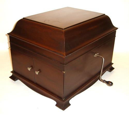 ![]() The mahogany cabinet of this IX is very nice. The original finish has been cleaned and polished, and there are just a few light signs of wear over the years. Measures 15 x 17 x 21 inches. ![]() The sound is also great on this machine. The motor has been recently oiled and cleaned, and works fine. Original green turntable felt.